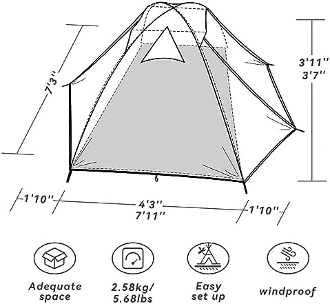 【LIGHTWEIGHT AND CONVENIENT】 The internal size of the Forceatt camping tent is 86.6×51.1×43.3in (220x130x110cm), which can accommodate two person at the same time. At the same time, it has a package size of 41 x 14cm and weighs 5.68lb (2.58kg), which saves space and is easy to carry.