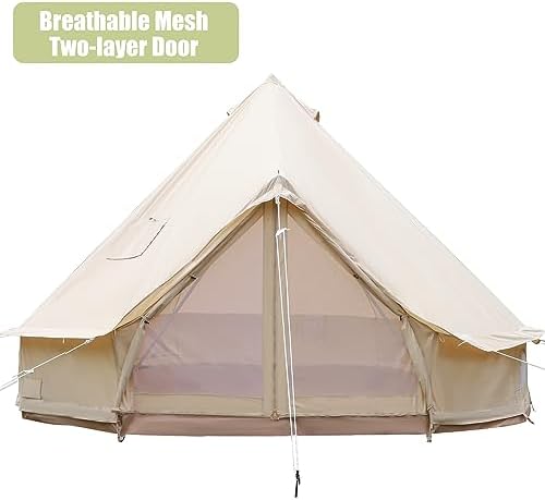 CERTIFIED PREMIUM MATERIAL: Our fabric all A passed through the SGS test, reject of UV-A and UV-B radiation up to 99.9%. Anti-tear cloth and waterproof coat, outstanding color fastness to light and corrosion resistance allow our camping canvas bell tent to keep appealing after using it for years. Diameter 32mm x 1.2mm galvanized steel pipe as a center pole and Diameter 19 mm x 1.00 mm galvanized steel pole as door pole. 20 ground nails and 10 adjustable guy ropes guarantee your safety
