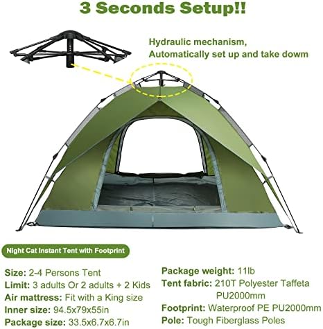 Night Cat Instant Popup Tents 2-3 Persons with Footprint Tarp Easy Setup Camping Zelt with Rainfly Double Layers Waterproof Automatic Hydraulic Mechaism