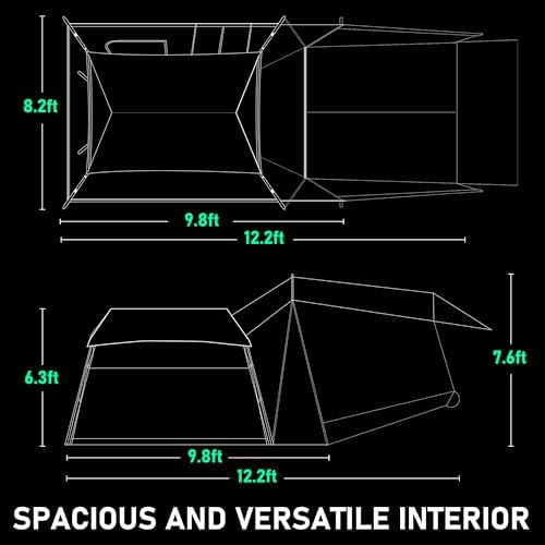 SPACIOUS AND VERSATILE INTERIOR: With generous dimensions of 10′ x 8.2′ x 6.3′, the ACtent provides ample room for a large family or group of friends. Each side features an 8′ x 5′ awning that can be extended for added shade.