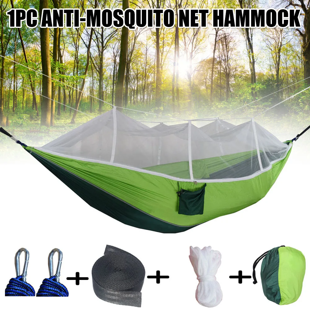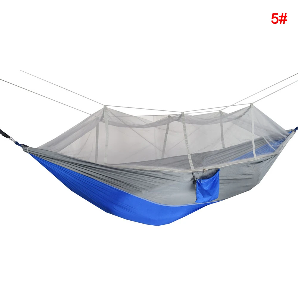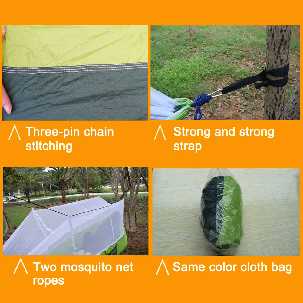 One side of the mosquito net is connected to the hammock, and the other side can be zipped or zip-off.
