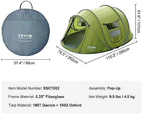 Enjoy Camping Again: Easily set up your pop-up camping tent by simply unpacking it and letting it assemble itself in seconds. No need for complicated instructions that waste precious camping time. The camping tent is spacious, measuring 110.2″ x 79.5″ x 51.6″, and can comfortably accommodate 3-4 adults with sleeping bags or 2-3 people with plenty of luggage. It is the perfect choice for camping.