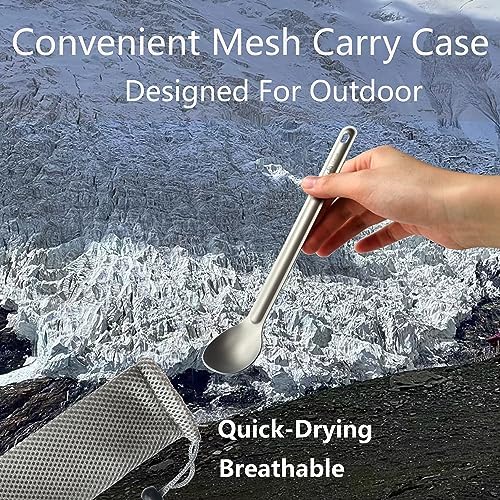 Product details: Each spoon measures 8.4″ long x 1.5″ wide (21.5cm x 3.9cm) and weighs 0.7 ounces (20 grams). made of high-quality titanium metal. delivery includes a storage pouch.