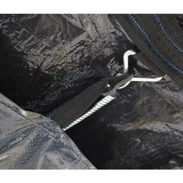 The 14 ft. Trampoline Weather Cover is a great way to protect your trampoline from the elements when not in use. It extends the life of the safety pad and jumping surface. Weather cover is designed with attachable hooks to connect to the V-rings. Weather cover is designed to most round trampoline. Weather cover is made from durable polyethylene material. Material is UV resistant and water proof. Center drain holes keep water from pooling on top of the trampoline during wet weather. It helps ice from forming on the trampoline in the winter.