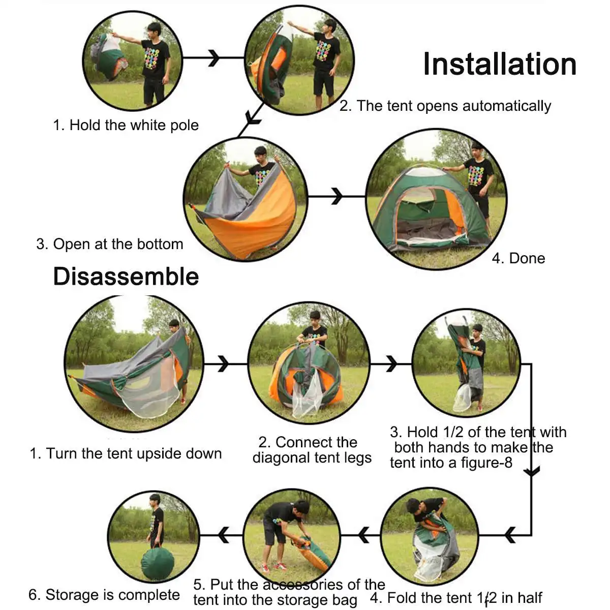 – Tent features: Ventilation, waterproof, fully automatic installation