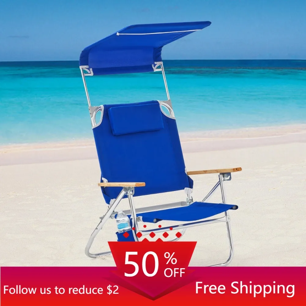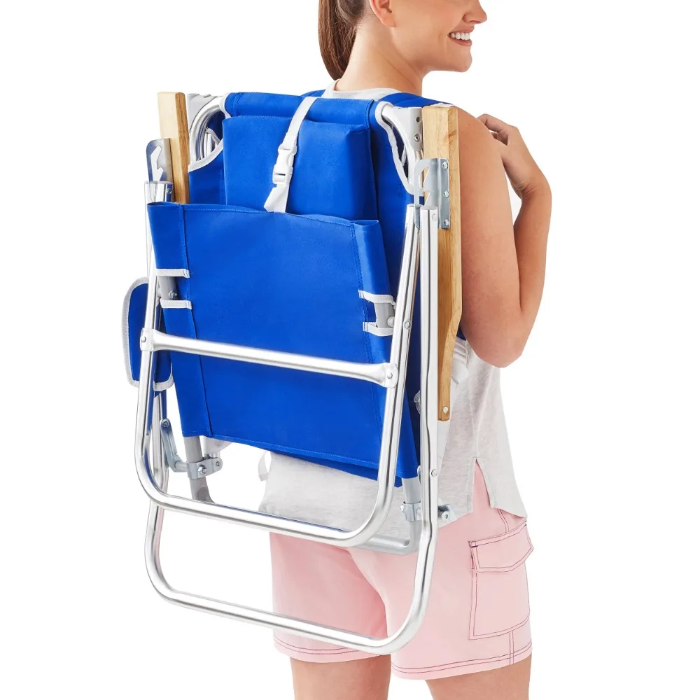 Go in style and with ease to the beach or other outdoor events with your Wood Arm Reclining Comfort Height Backpack Canopy Beach Chair. This chair features a lightweight and rustproof aluminum frame with steel inserts for added strength. The covering is a colorful, durable, and weather-resistant polyester fabric. Choose your favorite of three reclining positions. Wood armrests will stay cool under the sun. Use the attached color coordinated side drink holder to fit your favorite beverage. You’ll find a padded pillow headrest for added comfort and a mesh storage pocket on the back for additional storage. Attach the canopy to provide shade and additional comfort. A higher seat height of 13 inches makes it easier to get in and out of the chair. It folds flat for compact storage. Its weight of just 8.6 pounds along with adjustable padded backpack straps makes it easy to take anywhere. Take it to the beach, park, camping, or outdoor festivals and parades