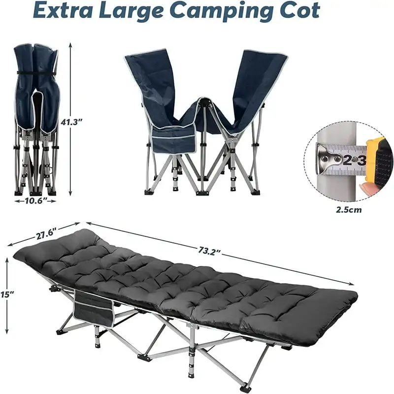 New Camping Cot is constructed in a upgrade 500D Double Layer Polyester for superior strength, water resistance and easy cleaning, equipped with the dutch velvet cot pad,is breathable. Gentle incline promises more morning back, neck or shoulder ache,will give you a better experience for sleeping and lying.Here are we provide a new design camp cot, All-in-one design,don’t worry about forgetting to bring the pillow or losing the pillow.The 3-IN-1 organizer pocket is for storing your cell phone,keys,water bottle,toys,earplugs and more. Perfect for camping, backpacking, beach, backyard, hiking, office etc.This camping cot is designed with tubular iron legs,Upgrade with 10 legs,25mm thickened oblate square tubes that adds the travel cot to best stability and carrying capacity. It easily supports up to 500 lbs at most. Perfect for tall and large size heavy people.Portable cots for adults and is assembly required. Only several seconds to install or fold the camping bed into storage bag. Super fast unfold and fold hugely is convenient for rest or transport and save your time and energy for you.