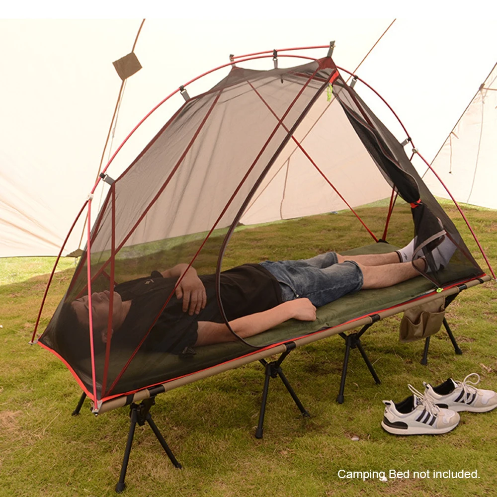 This camping tent is designed for your cot to elevate your sleeping platform and keep you away from the moisture and bugs. It is water-resistant, breathable and strong, great choice for outdoor camping, hiking, backpacking, etc.
