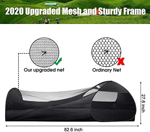 UPGRADED Tarp Top – This mosquito pop up tent has been upgraded with tarp top on the head part, which can block raindrops and sunshine (You can choose mesh top if you want to enjoy nature when lying inside). The bottom helps isolate from wet or muddy ground.