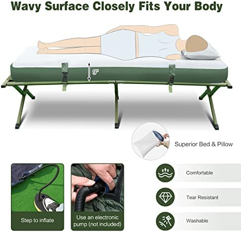 🌅5-In-1 Tent Combo🌅: The tent cot contains a camping cot, a tent, an air mattress, an air pillow (all covers included), and a sleeping bag to achieve 5-in-1 design. As needed, you could flexibly combine them as a bedding set, a tent combo or a sleeping tent cot for hiking, picnic or backpacking.