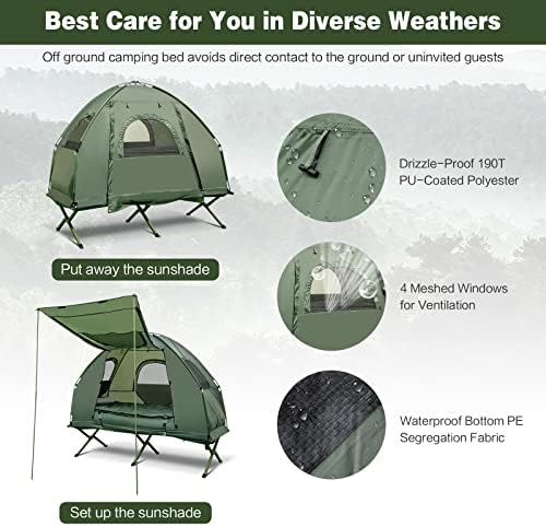🌅All-Weather & Elevated Design🌅: Best care for you in diverse weathers, the tent cot is made of 190T PU-coated polyester with proper drizzle resistance, while it comes with a large sunshade to block direct sunlight. Plus, the camping tent is 17” off the ground and has a bottom PE segregation fabric to avoid uninvited guests.
