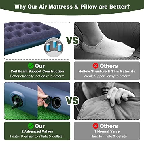 🌅Comfy Air Mattress & Pillow🌅: Why our air mattress & pillow are better? Currently, the interiors have been upgraded to 9” thick coil beam support constructions, with more elasticity and better resisting deformation. More, 2 advanced valves work very well for quicker and better sealed inflation & deflation. As needed, 2 inflating ways are available, step to inflate or use an electronic pump (not included).