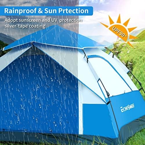 Waterproof and UV Protection: The EchoSmile easy setup tent features 190T PU polyester fabric and 2000mm PU coating, effectively preventing water from seeping into the tent. With UPF 50+ sun protection and durable fiberglass poles, it’s perfect for adventurous trips.