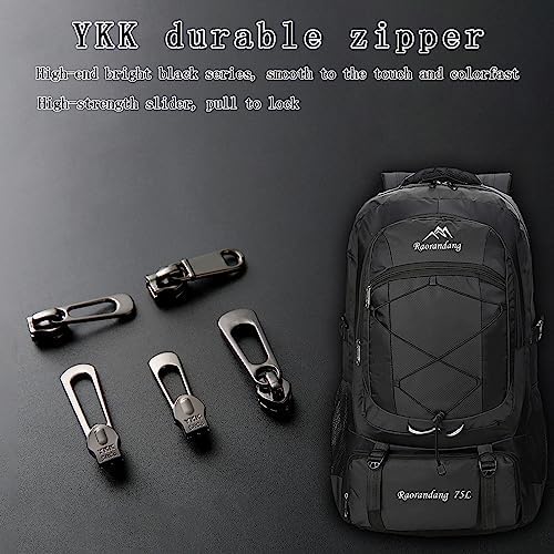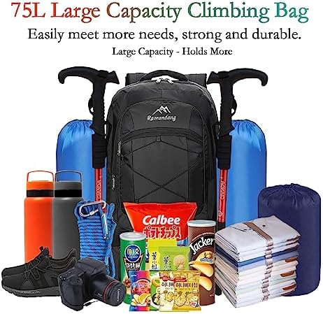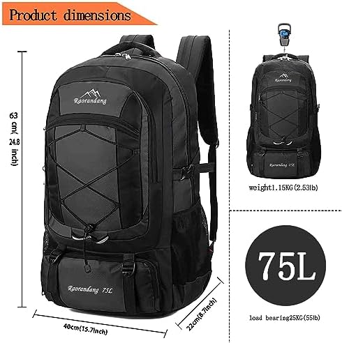 【Large Capacity】 75L extra large capacity kempingas backpack, one main zippered compartment, 3 zippered front pockets, two side straps, multiple hanging buckles. Backpack size 24.8*15.7*8.7 inches (63*40*22cm), the carrying capacity of the backpack is 44-55lb(20-25KG), can accommodate laptops, cameras, hiking crutches, tents, books, clothes, shoes, water glasses, umbrellas and other daily necessities.you can take this mountaineering backpack to travel, mountaineering, hiking, camping, fishing,etc.