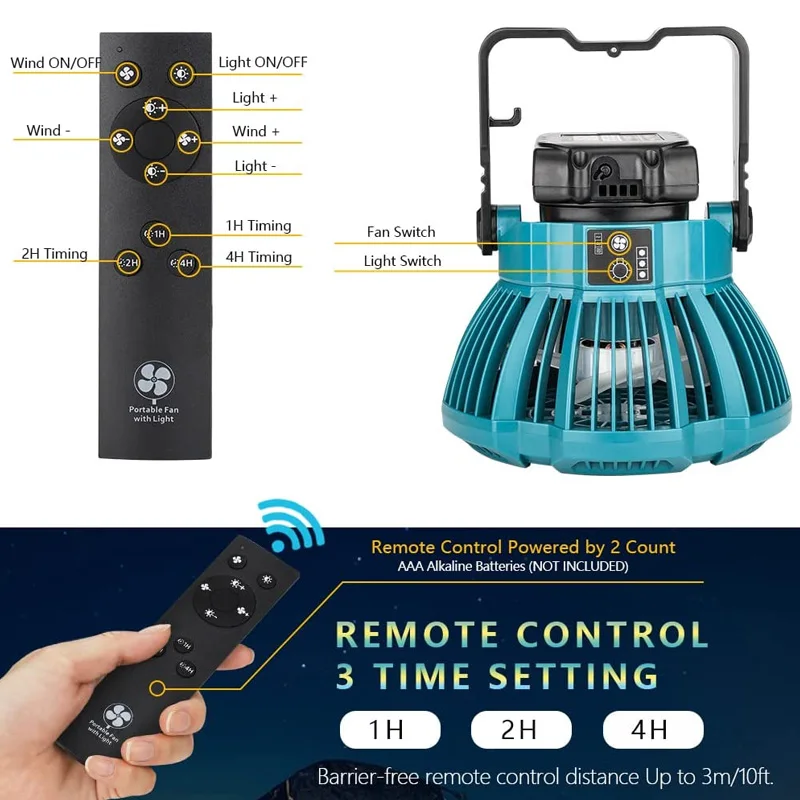 【Powered by for Makita 18V Lithium-ion Battery】 for Makita 18V all Lithium-ion batteries, BL1860 BL1850 BL1840 BL1830 BL1815 etc. Duration of use(fan and LED lights on at the same time): High-3H/Ah, Middle-4.5H/Ah, Low-6H/Ah. This camping fan for Makita can work continuously for at least 12 hours with 2Ah Lithium-ion battery. Absolutely the perfect outdoor fan!