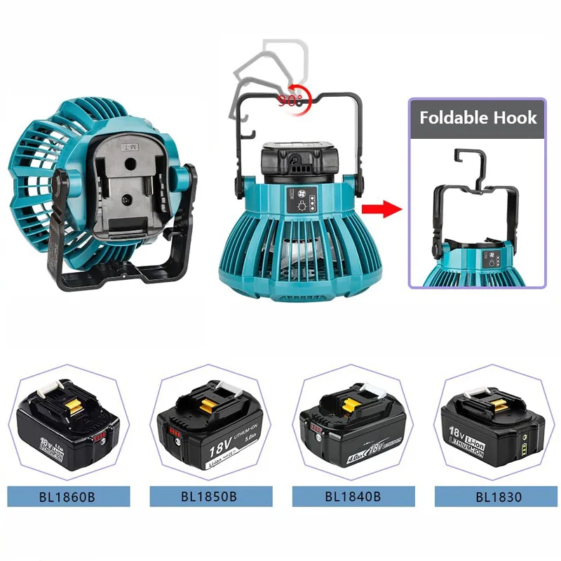 【Portable Compact Fan with Hook】 This outdoor ceiling fan for Makita has a built-in foldable hook, can be better hung on tents, cars, branches, walls, outdoor as well as simply placed on desk at home or in office.